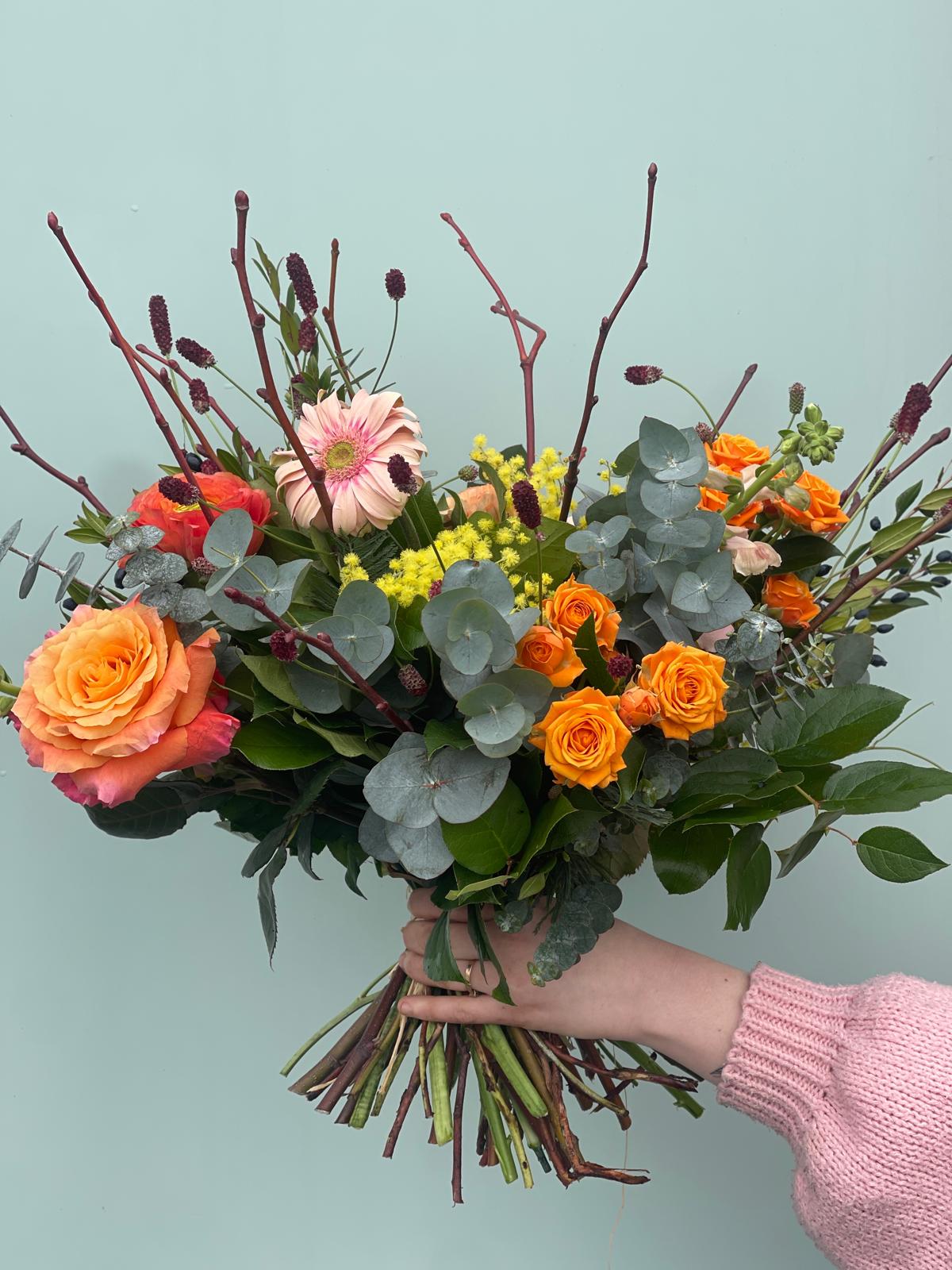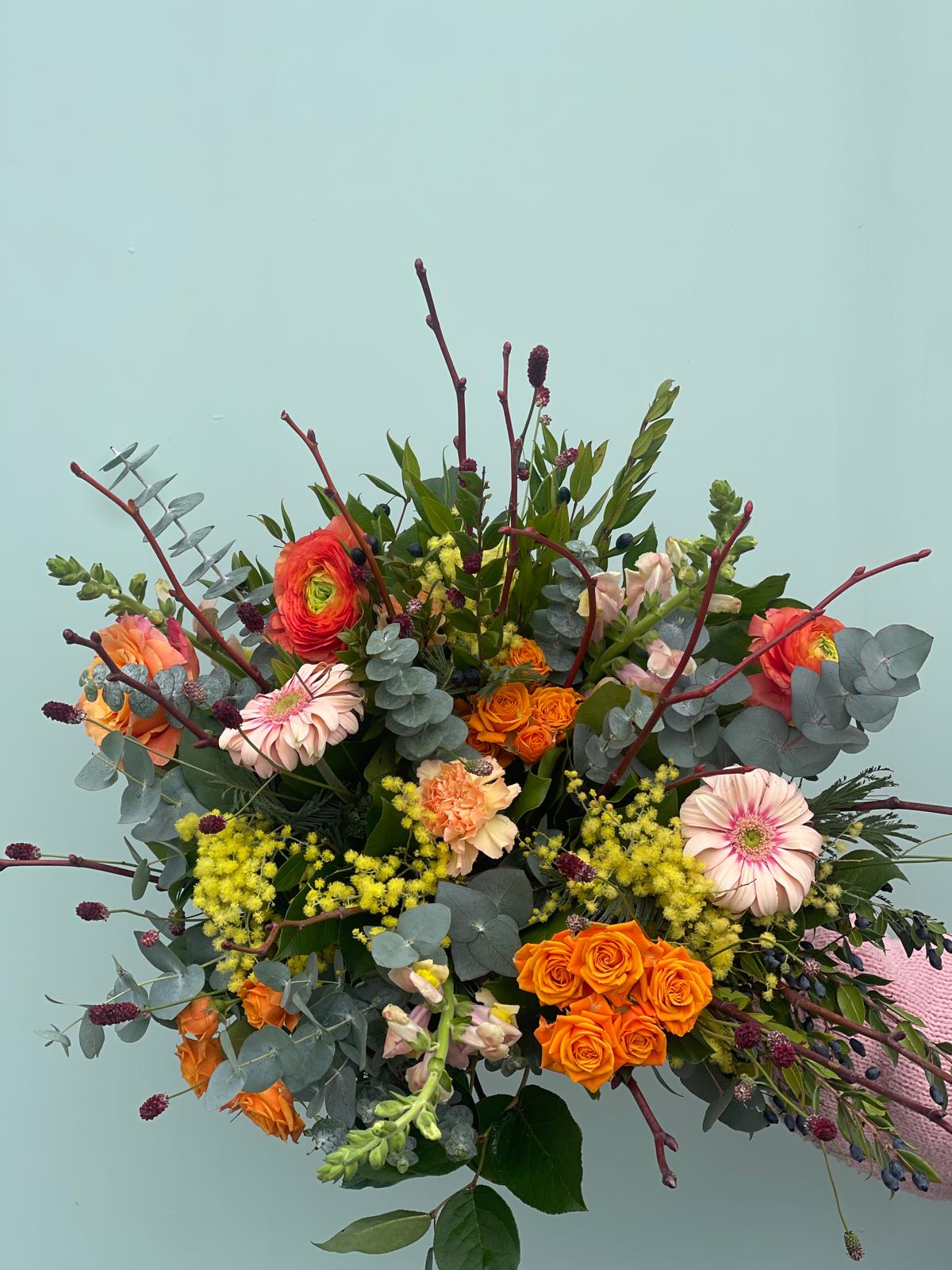 Renoncule française, mimosa, muflier, gerbera, rose d’Équateur, rose branchue, dianthus, eucalyptus, sanguisorba.