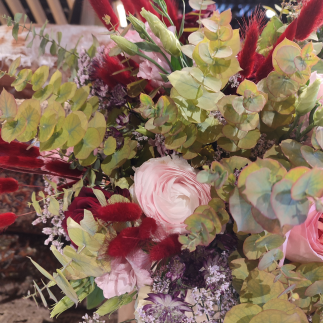Rose rouge Naomi, limonium, lisiabthus, rose ancienne, renoncule, astance, lagurus et différents feuillages.
